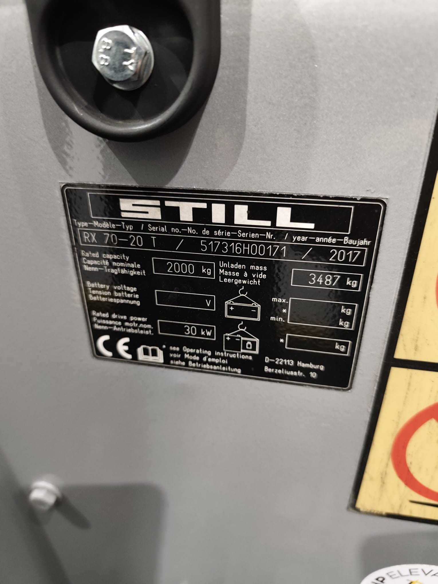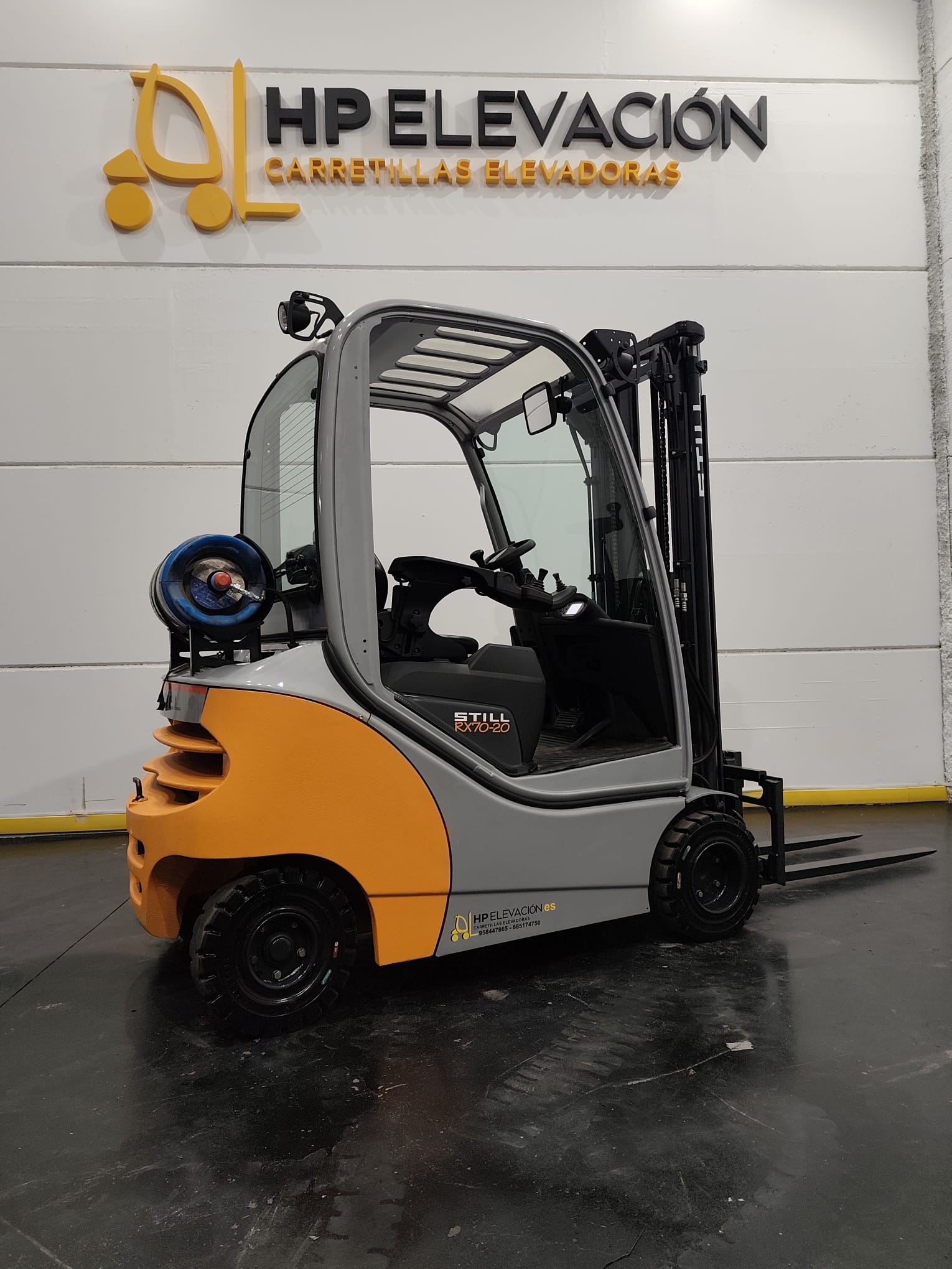 Carretilla elevadora STILL RX 70-20 T térmica GLP, capacidad 2.000 kg, año 2017, con mástil tríplex y elevación libre (5.065 mm). Equipada con desplazador lateral, 4ª función hidráulica, cabina protectora y faros de trabajo. Máquina potente, estable y fiable para uso industrial. Equipo original, operativo y en funcionamiento.